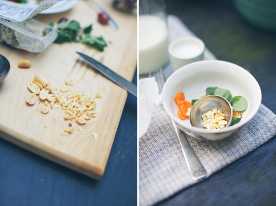 Do you ever just get a craving for something and you don't know where to get it? When I was in Connecticut shooting this fall, the chef from the weekend made the most simple, delicious peanut noodle salad. I could have eaten the whole bowl if I wasn't working. So I thought, I bet I could make that at home! I researched recipes and came across Smitten Kitchen's recipe and used a moderation of the peanut sauce and then added my own ingredients that I already had. Which was sliced baby carrots, crushed peanuts and mache. Maybe next time I'd go with some pea shoots or some crunchy thai cabbage to throw in there. I used linguini noodles because that's what I had the first time- and I like thicker noodles.